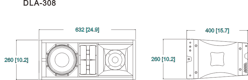 DLA308的高频部分采用了2只1.75"音圈钛膜单元。采用精密等路径号角负载,将高频声频波形由球面波转换为等相位平面波,极大减少了高频干涉效应,使远距离下声音清晰度大大提高。高达106dB/1W/1M的灵敏度,及高达131dB的峰值声压,使DLA308能满足任何中小型演出要求的动态范围需要。